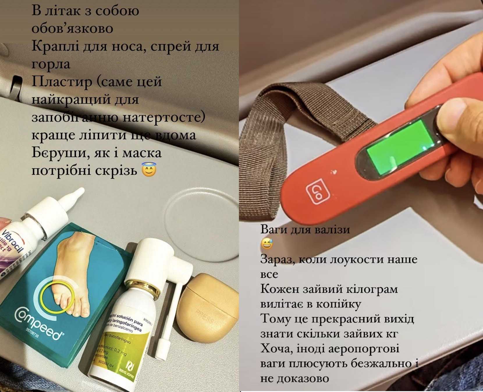 Тут можна побачити маску для сну, беруші для вух, спрей для носа, пластир, протисонцеві окуляри. Є навіть одноразові виделки. А щоб не перестаратися і не набрати зайвого багажу, за який потім доведеться переплачувати в літаку, Катя має індивідуальні ваги.