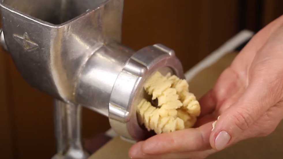 Дуже довго місити не потрібно. Тісто має бути однорідним та м’яким. Перекладіть його в глибоку миску, затягніть харчовою плівкою верх і відправте в холодильник на 30 хвилин. З ручної м’ясорубки (інших у ті часи не було) витягніть ніж і решітку для м’яса й поставте насадку для печива.