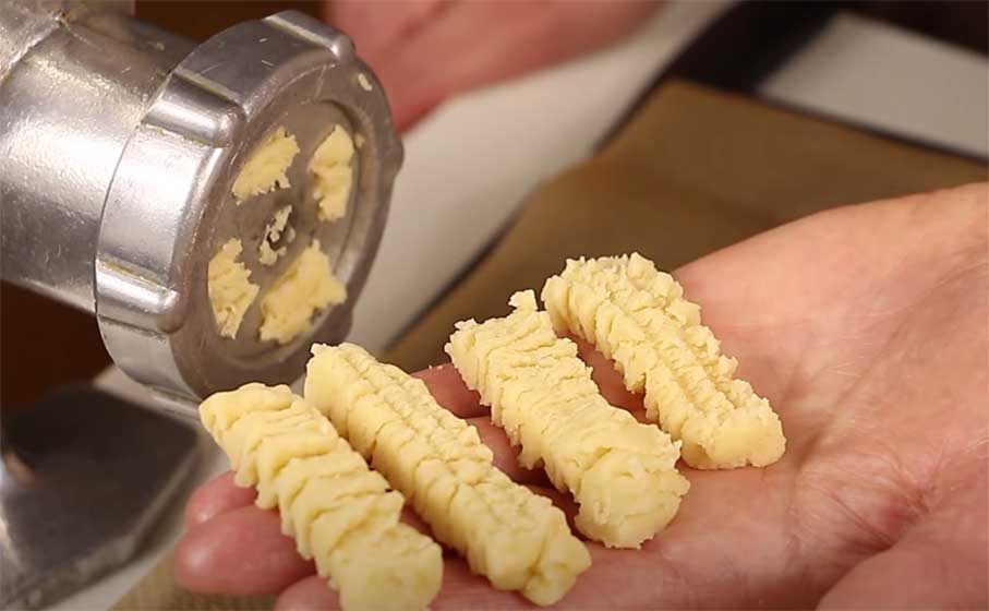 Кладіть шматок тіста в м’ясоприймач і крутіть ручку. Коли з отворів вилізе 5-6 см тіста, обріжте ножем. Це і будуть заготовки для майбутнього печива. Викладайте фігурні шматочки тіста на деко, вистелене пергаментом, на невеликій відстані одне від одного.