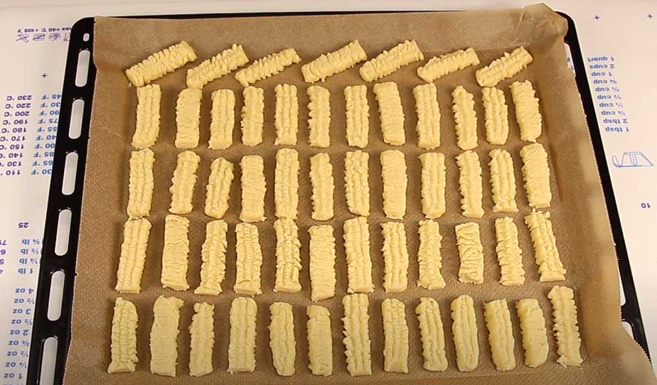 Якщо у вас немає решітки для печива, скористайтеся звичайними отворами для м’яса і викладіть шматочки тіста гірками на деко. Якщо відсутня й м’ясорубка, тоді наліпіть будь-які фігурки й відправляйте запікатися.