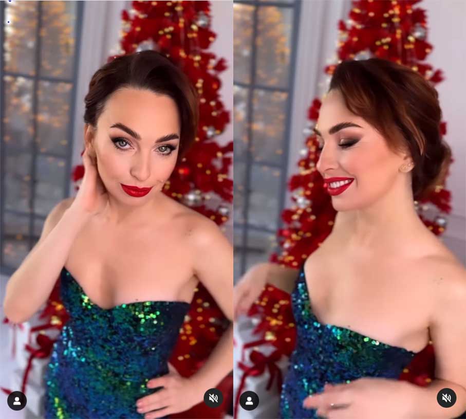 Гумористка поєднала блиск та зелений колір, що гарно переливається, поєднуючись із синіми відтінками. Сукня приємно облягає тендітний стан зірки й відкриває на показ шию та плечі.