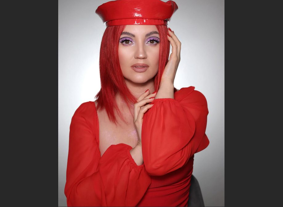 Святковий казковий образ зірка доповнила червоною береткою. Навіть волосся та губи зробила у спільній яскравій гамі. Тільки тіні для повік використала бузкові. Дивно, що в такому образі у цю чарівну голівку прийшли дуже серйозні думки щодо мовного питання.