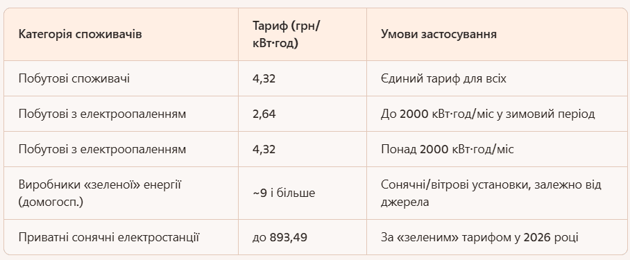 Для більшості українців на початок 2026 року тариф за електроенергію залишиться незмінним, тобто за кожен використаний кіловат доведеться сплачувати 4,32 гривні. Ті, хто опалює своє житло за допомогою електрики, мають знижку, сплачуючи 2,64 грн/кВт.