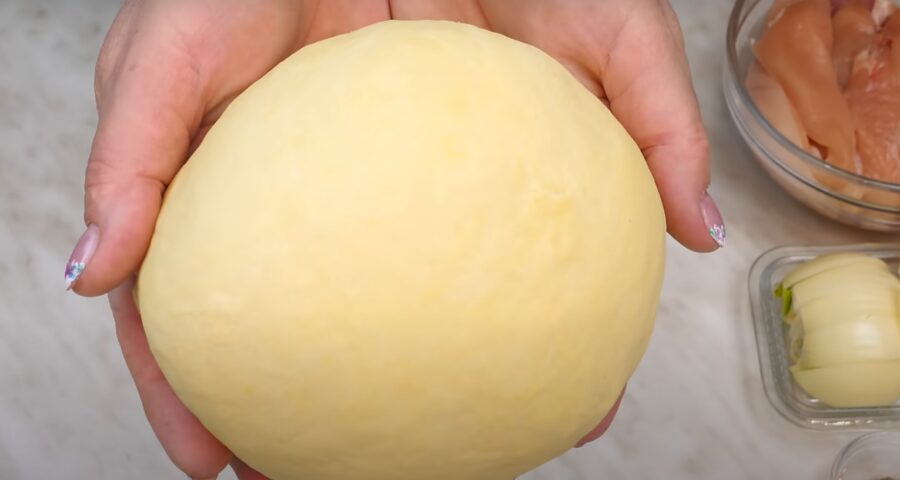 Для початку потрібно змішати одне яйце з сіллю та рослинною олією. В іншу миску просіюємо борошно, додаємо яєчну суміш і добре перемішуємо, щоб яйце не “зварилось” під час заварювання тіста. Далі додаємо 1 склянку крутого окропу, який тільки закипів. Швидко мішаємо, не зупиняючись. Переміщаємо суміш з миски на стіл і продовжуємо вимішувати, поки тісто не стане однорідним, гладеньким і пружним. Додатково борошно підсипати не потрібно. Готове тісто потрібно залишити “відпочити” на 10-15 хв. Тісто виходить дуже м’яким і слухняним.