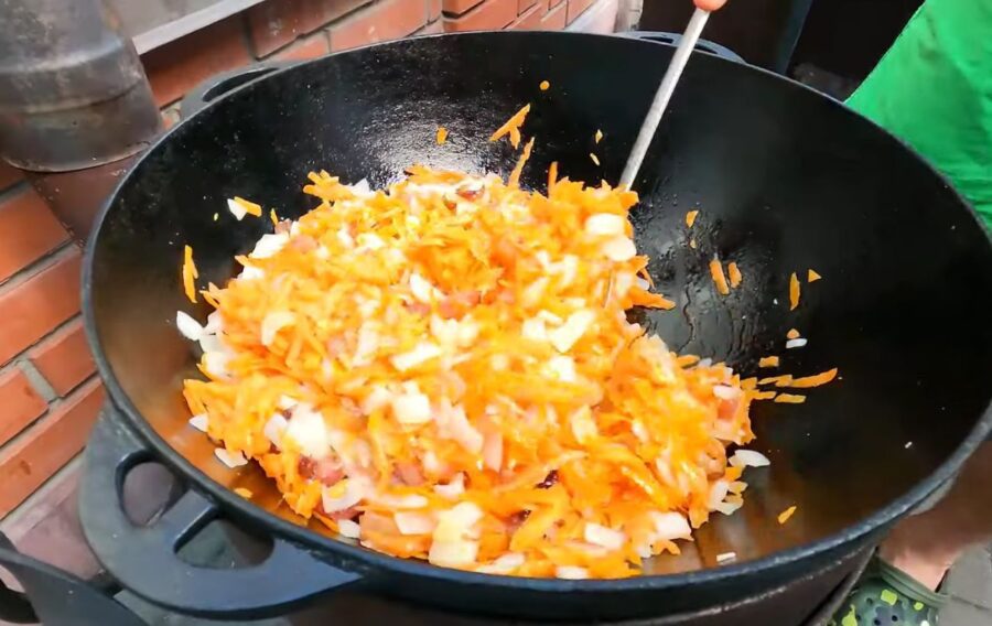 Перш ніж почати приготування, запарте пшоно в окропі – це потрібно, аби позбутись від гіркоти. Далі наріжте сало невеликими кубиками та у каструлі з товстим дном обсмажте його до золотавої скоринки. Наріжте всі необхідні овочі та подрібніть зелень. Цибулю очистьте та поріжте кубиками, розчавіть декілька зубчиків часнику. До сала додайте цибулю та часник і смажте декілька хвилин. Потім додайте моркву, зелень і селеру. Добре перемішайте та одразу додайте молоко та воду. Далі вкиньте у казанок лавровий лист і перець. Варіть суміш 15 хвилин на помірному вогні.