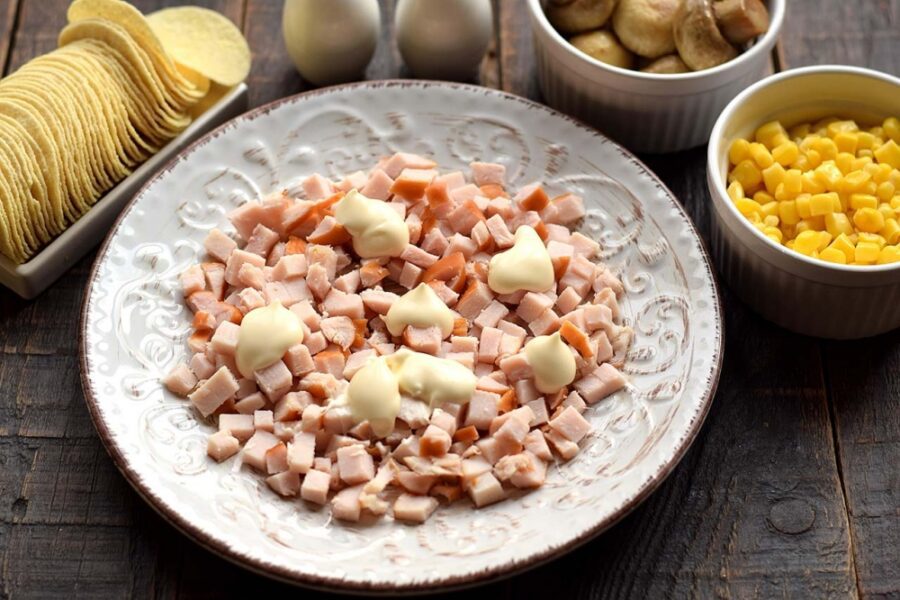 Перш за все потрібно приготувати всі необхідні для салату продукти. Копчену курячу грудку наріжте кубиком та викладіть на плоску тарілку. М’ясо буде нижнім шаром вашого салату. За бажання копченості можна замінити відвареним курячим філе. Зверху додайте небагато майонезу.