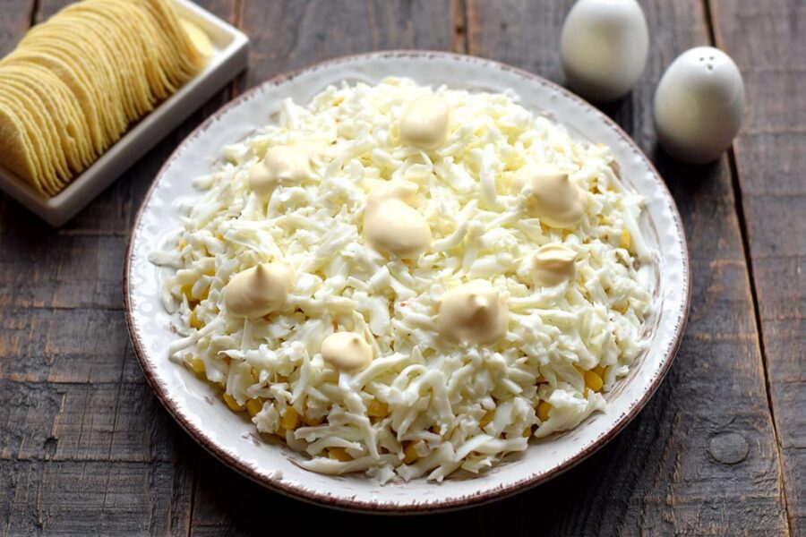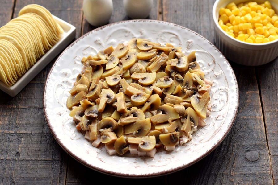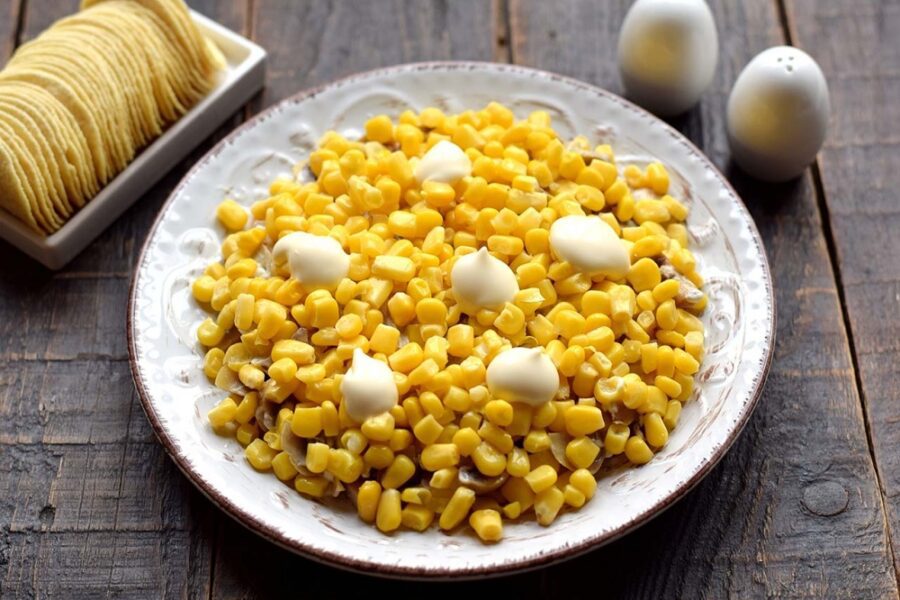 Консервовану кукурудзу перекиньте з банки на сито, аби стік весь маринад. Потім пересипте її на гриби, а зверху не забудьте додати майонезу.