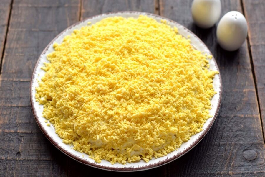 Жовтки натріть на найменшій тертці та викладіть зверху на салат. Так виглядатиме верхівка вашої страви.
