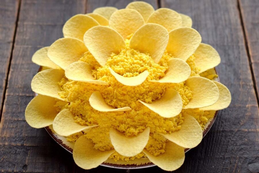 На святковий стіл завжди хочеться приготувати щось смачне та цікаве. Чудово відомий всім салат “Олів’є” точно набрид кожному, саме тому пропонуємо звернути увагу на цей цікавий варіант смаколика. “Хризантема” з чіпсами не лише має цікавий вид, але й чудово смакує. Аби точно здивувати своїх гостей, закупіть потрібні інгредієнти та беріться до приготування страви.