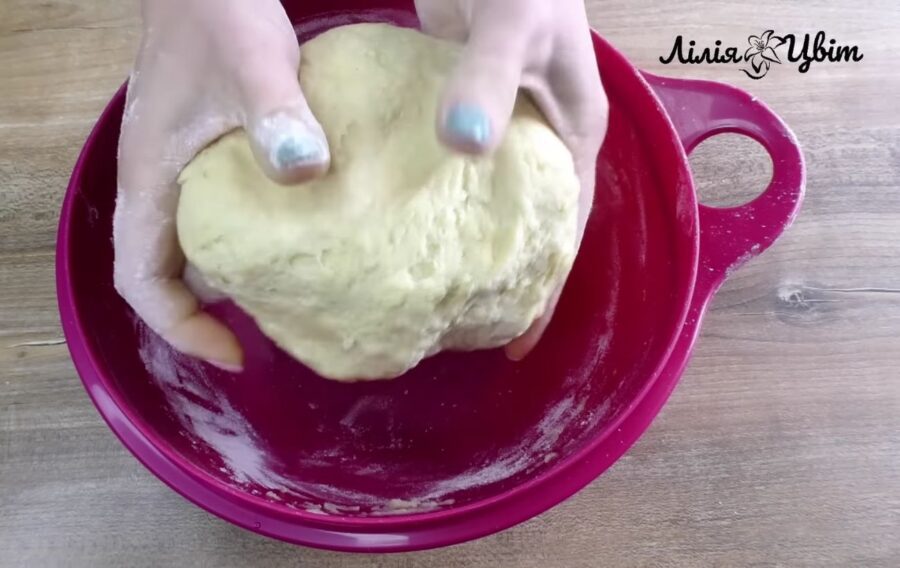 Візьміть глибоку миску та змішайте в ній олію з водою та ванільним цукром. Добре перемішайте отриману суміш. Потім просійте пшеничне борошно через сито та змішайте його з розпушувачем. Цю суміш додайте до рідини декількома частинами, постійно помішуючи. Почніть замішувати тісто, використовуючи спочатку ложку, а потім – руки. Зауважте, що тісто має вийти еластичним і дуже м’яким.
