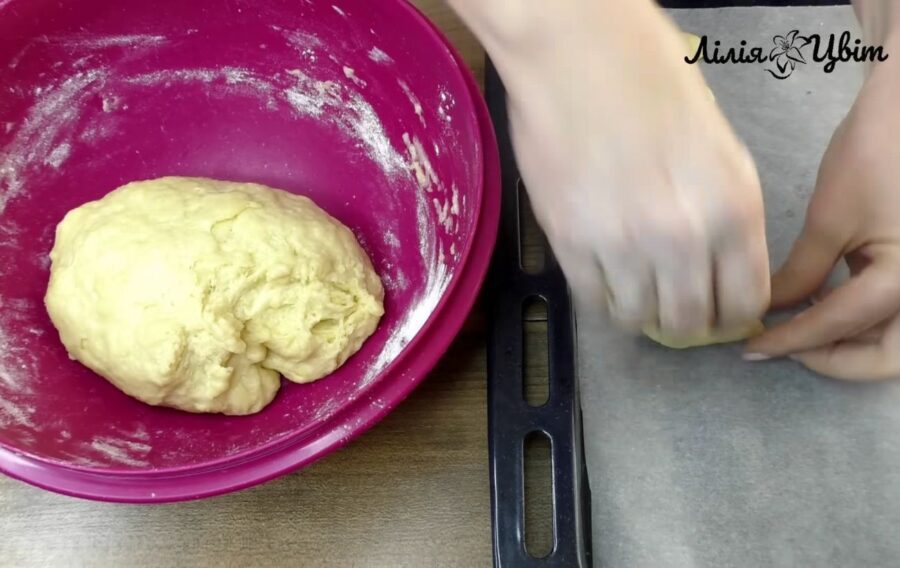 Поставте духовку розігріватись до температури 180 градусів. Візьміть деко, на якому готуватимете печиво. Застеліть його пергаментним папером. Почніть формувати печиво, відриваючи від тіста невеликі шматочки. За бажанням, можете розкачати тісто та вирізати бажану форму.