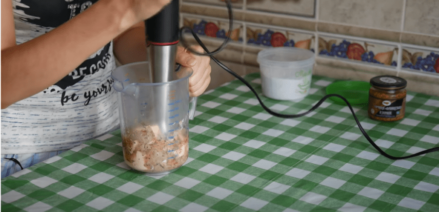 Беремо погружний блендер і гарненько перебиваємо всі інгредієнти в однорідну масу. Якщо блендера в домі немає – не біда. Беремо виделку і по старинці розминаємо, спочатку кожний інгредієнт окремо, а потім все перемішуємо.