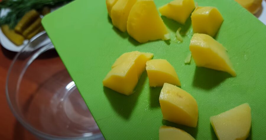 Теплу відварену картоплю очищаємо від шкірки і нарізаємо недрібним кубиком.