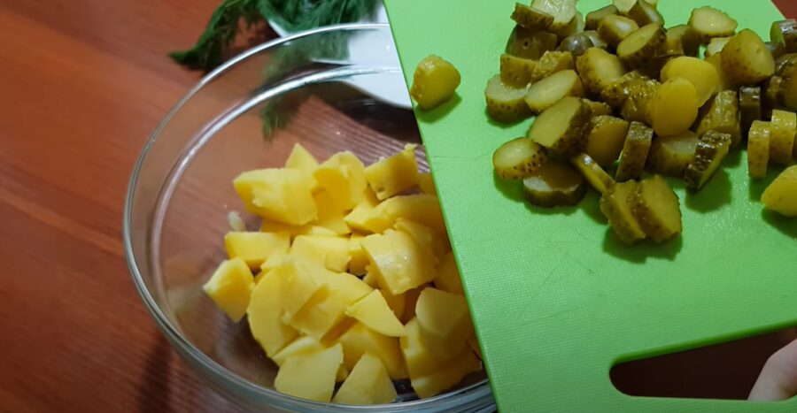 Солоні або мариновані огірки нарізаємо в довільній формі і додаємо до картоплі. Шматочки огірків мають бути меншими за шматочки картоплі.