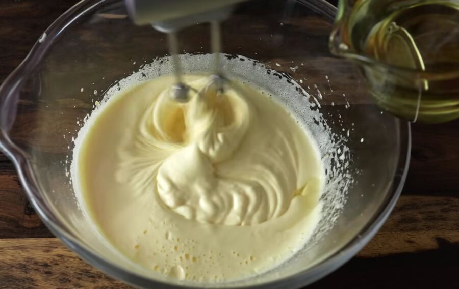 У миску вбийте яйця та змішайте його з білим та ванільним цукром. Добре збийте отриману суміш до повного розчинення всіх інгредієнтів. Для того, аби спростити процес приготування можете використовувати міксер. До яєць із цукром додайте олію та йогурт, знову все добре збийте. Потім просійте борошно з розпушувачем і додайте порціями до рідини.
