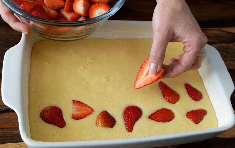 Візьміть форму, в якій готуватимете свій пиріг, та застеліть пергаментом. Додатково змастіть її маслом або олією. Влийте у цю форму половину готового тіста та вирівняйте ложкою, дерев’яною або силіконовою лопаткою. Розріжте полуниці на чотири частини, обваляйте кожну частинку в крохмалі та викладіть на тісто половину ягід. Зверху залийте отриману масу залишком тіста та викладіть полуниці, що залишились.