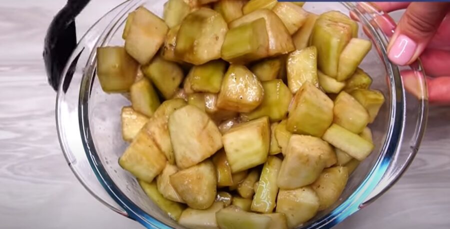 Нарізані баклажани додаємо до яєць і добре перемішуємо, щоб всі шматочки окунулись в яєчну масу.