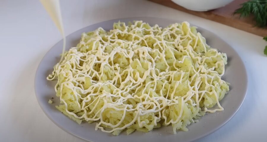 Підготуйте велику, плоску тарілку. Першим шаром викладаємо натерту картоплю на крупну тертку. Солимо і перчимо за смаком. Картолю змащуємо щедрим шаром майонезу.