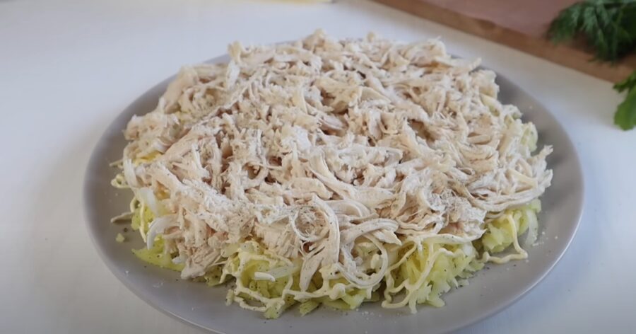 Наступним шаром йде маринована цибуля, яку попередньо треба добре віджати від маринаду. Викладаємо її рівномірно по картоплі. Наступним шаром йде куряче філе, яке потрібно розібрати на волокна. Присолюємо, додаємо перець та змащуємо майонезом.