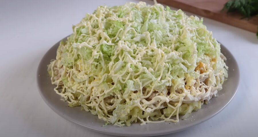 Наступним шаром буде пекінська капуста. Використовуємо половину капустини, але ріжемо її не вздовж, а поперек і беремо найніжнішу частину качана. Ріжемо капусту тоненькою соломкою. Викладаємо капусту на яйця з майонезом і ще раз змащуємо майонезом.