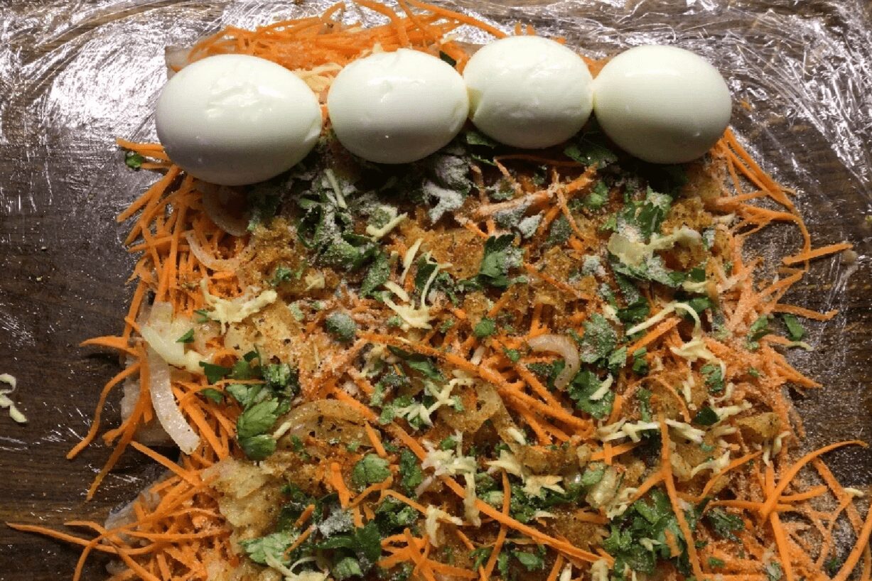 Починайте приготування страви з начинки. Поставте варити яйця в круту. Самі ж тим часом моркву натріть на тертушці як на корейський салат. Почищену цибулю наріжте півкільцями. Овочі трішки підсмажте на олії. Петрушку подрібніть ножем. Відварені яйця почистьте.