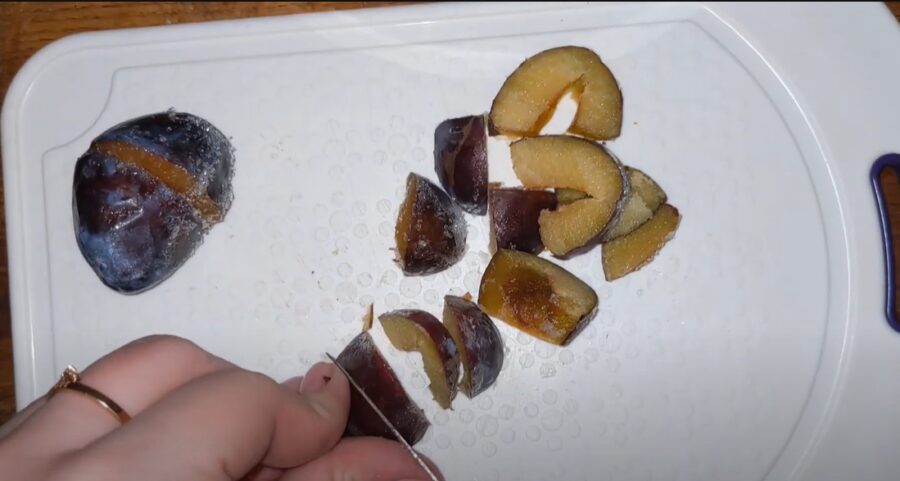 Для початку підготуємо сливи. Можна використовувати свіжі фрукти, або заморожені. Сливи миємо, просушуємо, чистимо від камінчика і нарізаємо на невеличкі шматочки.