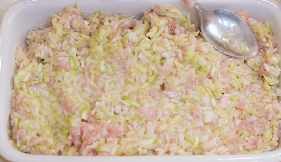 Цибулю очистіть від лушпиння, промийте в холодній воді і дрібно наріжте. З’єднайте підготовлений фарш з нарізаною цибулею, відвареним рисом та кабачками. Туди ж вбийте два курячих яйця, підсоліть та перемішайте.