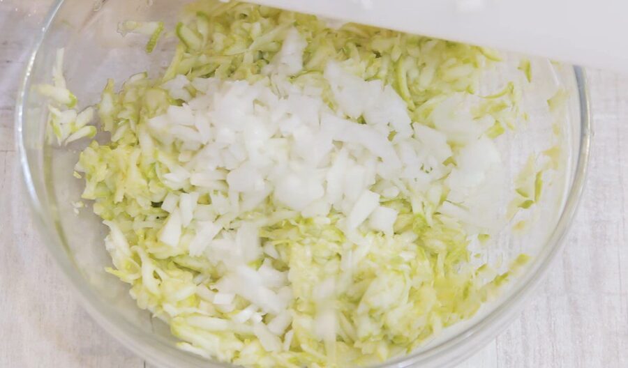 Помитий кабачок натріть на великій тертці, присоліть та залиште на 10 хвилин, щоб пустився сік. Вибирайте молоді плоди з ніжною шкіркою. Дуже тоненьку шкірку зрізати не обов’язково. Якщо використовуєте зріліші кабачки, зріжте грубу шкірку і виріжте серединку з насінням.