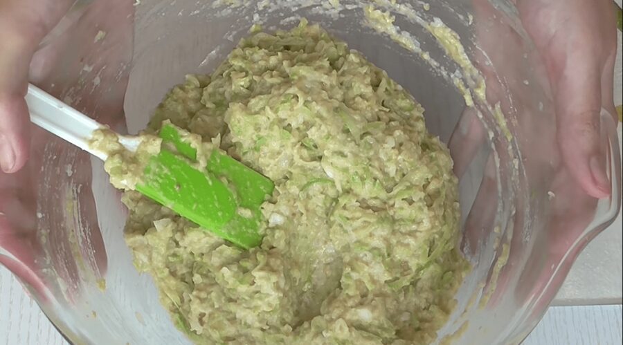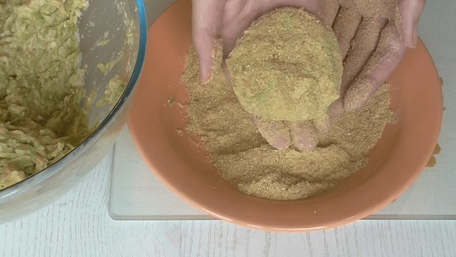 З кабачків повністю відтискаємо всю вологу, що утворилася. До кабачків додаємо цибулю, батон, яйця, майонез і спеції. Все ретельно перемішуємо. Секретом цих кабачкових котлет є коріандр. Саме він надає овочевому фаршу м’ясного аромату. Також у фарш додаємо борошно та панірувальні сухарі і перемішуємо.