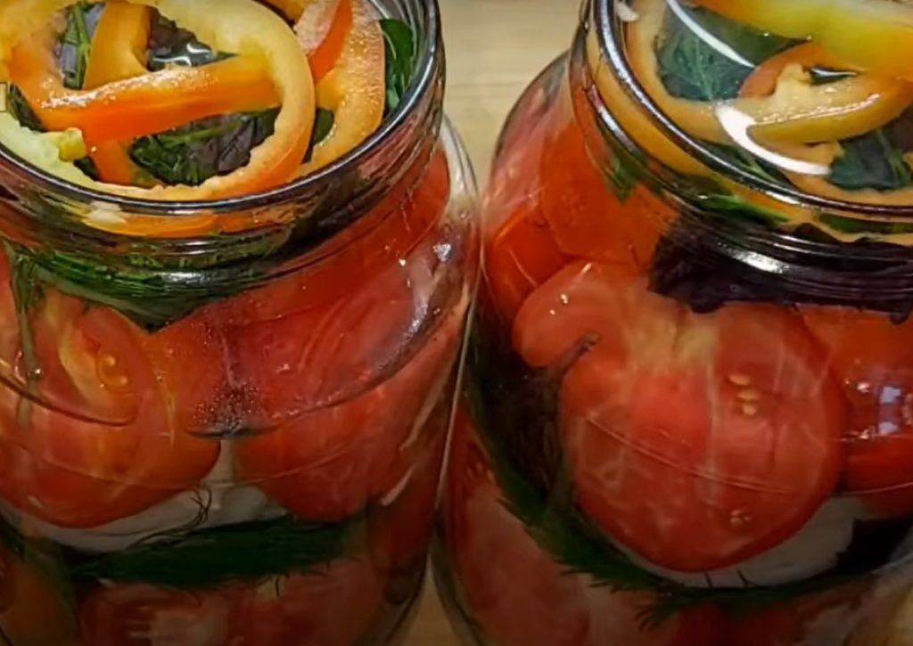 Банки вимийте з господарчим милом і дуже ретельно сполосніть. На дно кожного слоїка покладіть цибулю, часник, болгарський перець і зелень. Тепер викладіть шар половинок помідорів, присипте зеленню, цибулею й перцем. Потім знову томати й знову зелень й решта інгредієнтів.