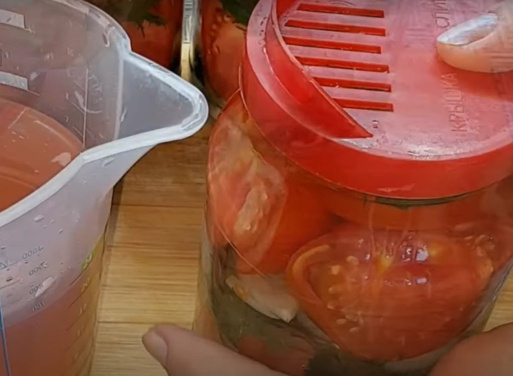 Коли банки будуть наповнені, залийте їх окропом, прикрийте кришками та залиште на 15 хвилин. Злийте воду в окрему каструлю. Додайте 100 мл води, сіль, цукор і доведіть до кипіння. Після цього проваріть 2 хвилини, влийте оцет (70%) і ще зовсім трішки прокип’ятіть.
