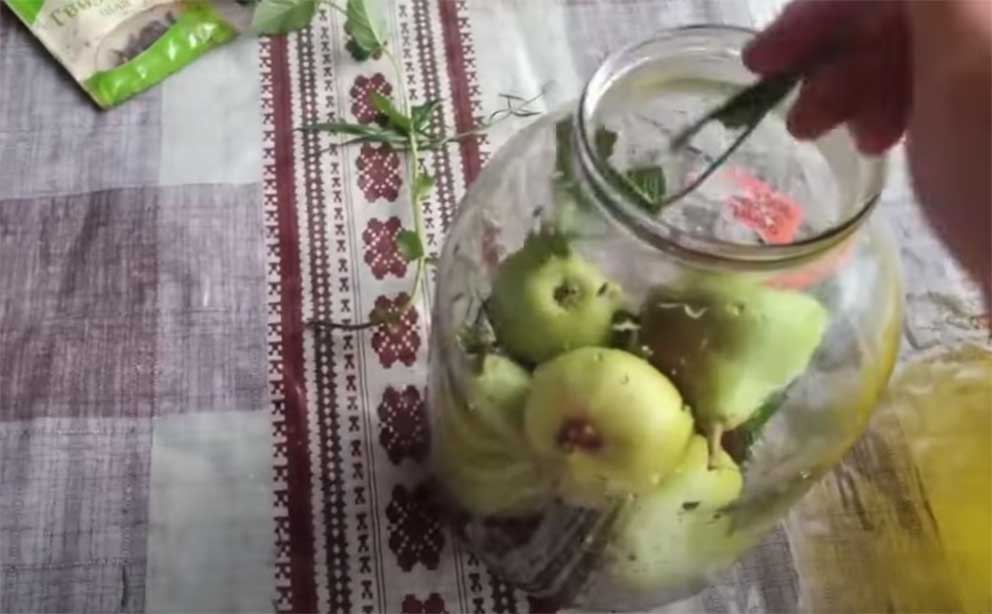 У підготовлені слоїки розкладайте груші, пересипаючи смородиновим листям і додаючи паличку кориці. Якщо корицю не любите, можете проігнорувати цей пункт. До самого верху не насипайте. Достатньо буде закласти плоди по плечика.