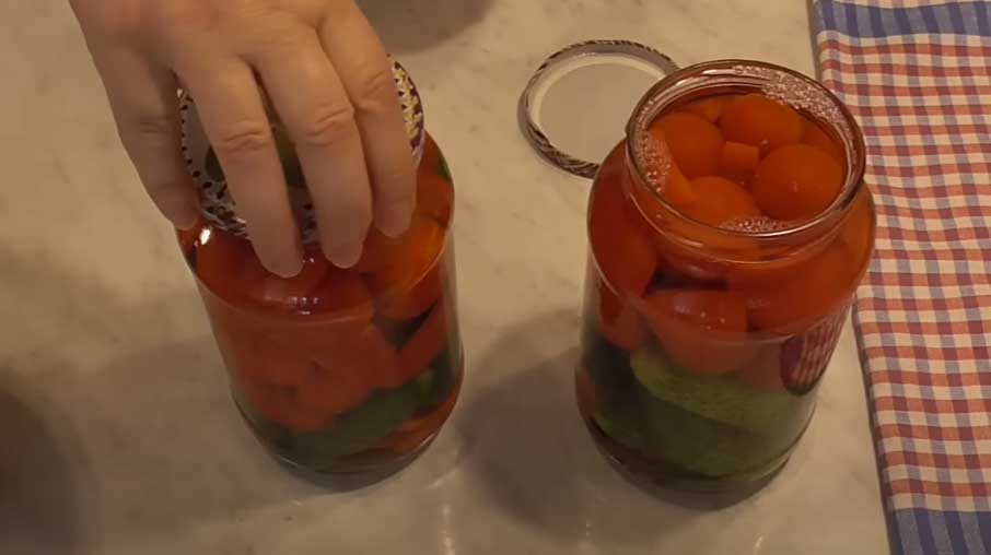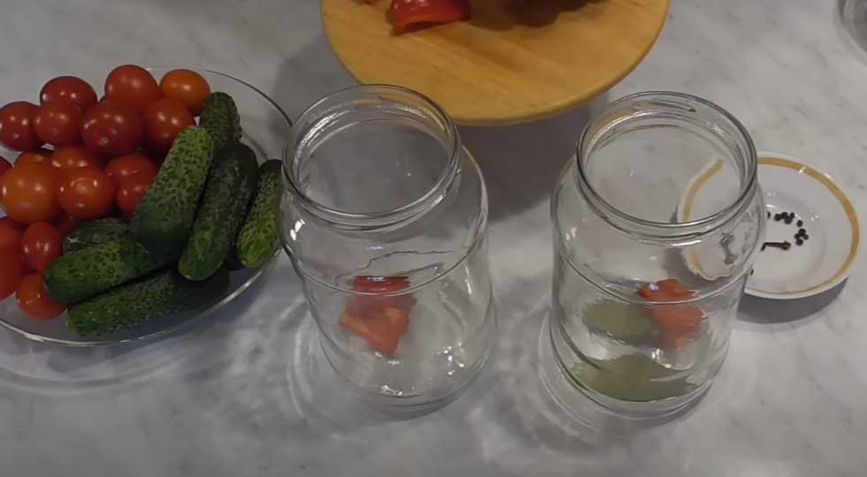 Починайте розкладати овочі з огірків, а на них викладайте перець, почищений від насіння й розрізаний на четвертинки, та помідори. Закип’ятіть воду й відразу ж розлийте по слоїках з овочами, намагаючись лити на середину, а не по краях, щоб скло не тріснуло. Банки прикрийте кришками й дайте постояти 15 хвилин.