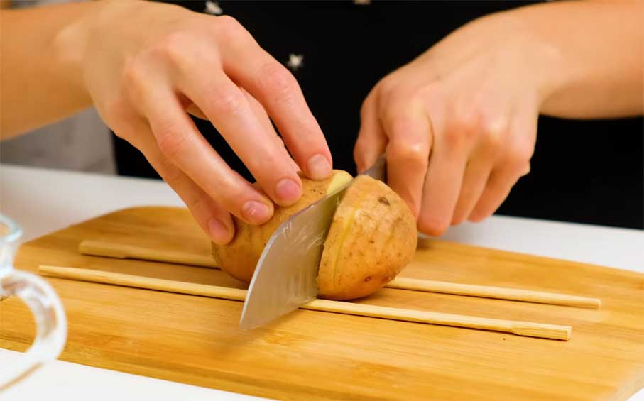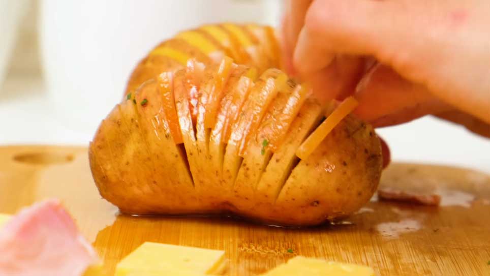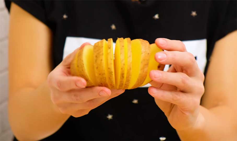 Покладіть картоплину на дошку між двох шпажок і починайте робити надрізи впоперек так, щоб низ залишився суцільним. Наріжте сир на шматочки, по ширині картопляних пластин.