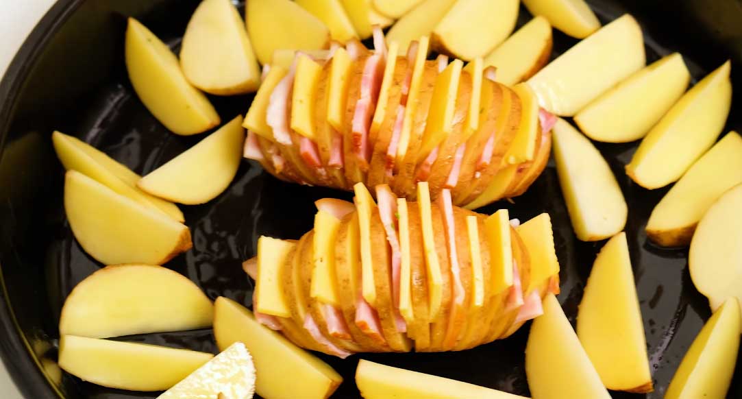 У змащені олією кишеньки закладайте шматочки сиру й бекону. Форму для запікання змастіть олією і викладіть наші гармошки так, щоб вони не торкалися одна одної. Поставте в розігріту до 200 градусів духовку і випікайте пів години чи трішечки більше, якщо картопля недостатньо встигла зарум’янитися.