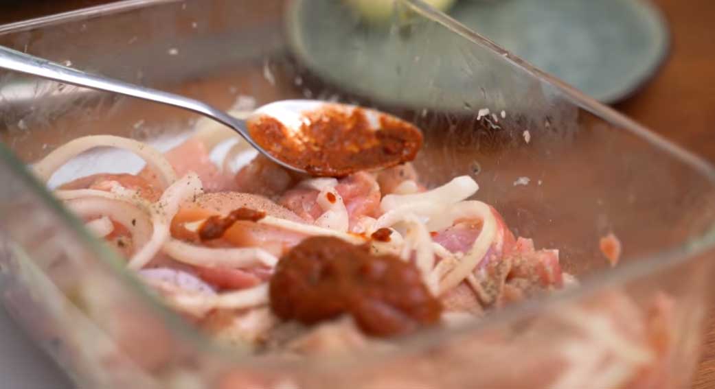 Додайте трішки чорного меленого перцю, аджику, долийте кефір і все перемішайте. Решту цибулі наріжте товстенькими кружальцями й викладіть поверх м’яса. Закрийте кришкою і відправте в холодильник маринуватися. Треба витримати хоча б 3-4 години, а краще цілу ніч.