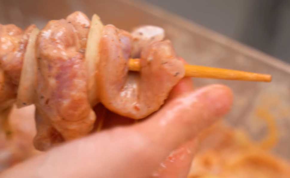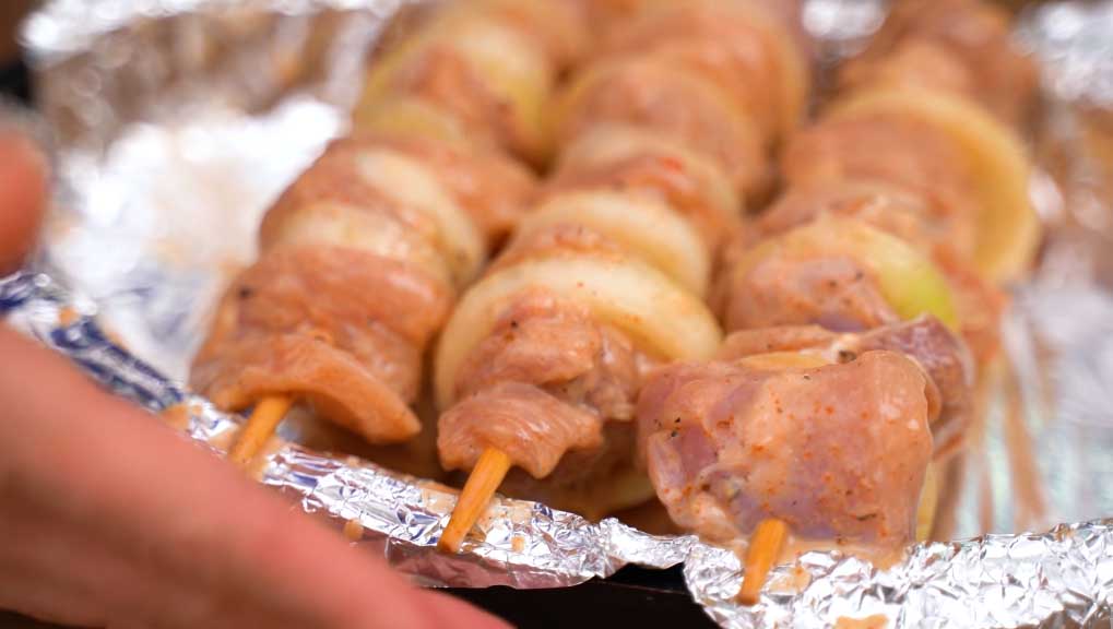 Можете використати палички для суші з бамбука, але попередньо змочіть їх водою. Нанизуйте шматочки курятини на палички, чергуючи з кружальцями цибулі. Викладайте на деко, встелене фольгою. Бажано, щоб краї паличок діставали країв форми, опираючись на них, а м’ясо не лежало на фользі, а висіло в повітрі.