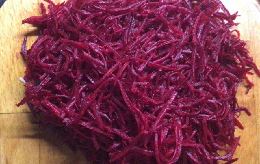 Для початку потрібно відварити буряк та залишити його, аби він охолонув. Наступним кроком потрібно натерти овоч на тертці так, ніби готуєте корейську моркву. Відкладіть миску з тертим буряком.
