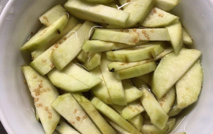 Баклажан потрібно очистити від шкірки та залити злегка підсоленою водою. Таку суміш залиште на 20 хвилин.