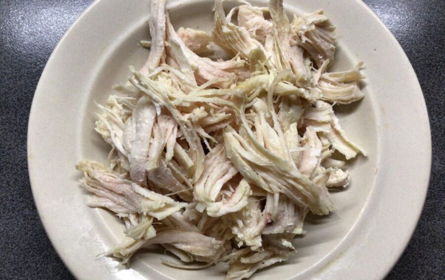Куряче філе відваріть у злегка солоній воді та наріжте після того, як м’ясо охолоне.