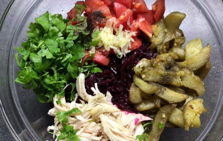 Коли всі овочі на городі зібрано, настав час насолодитись смачними стравами, приготованими з додаванням плодів. Так, якщо ви особливо уважно стежите за своїм харчуванням і фігурою, вам точно сподобається цей салат. У його складі – лише корисні овочі, відварне та низькокалорійне м’ясо, тому ваш організм лише подякує вам за такий смачний перекус.