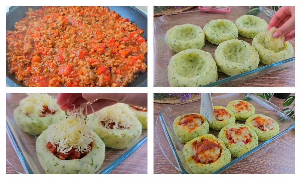 9. Тепер наповнюйте отвори ватрушок спочатку сиром, потім фаршем, а потім знову сиром.