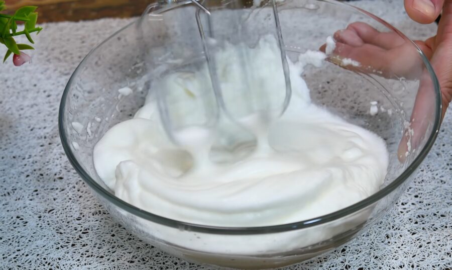 В окремій мисці збиваємо охолоджені білки з дрібкою солі міксером. Збиваємо до утворення піків.