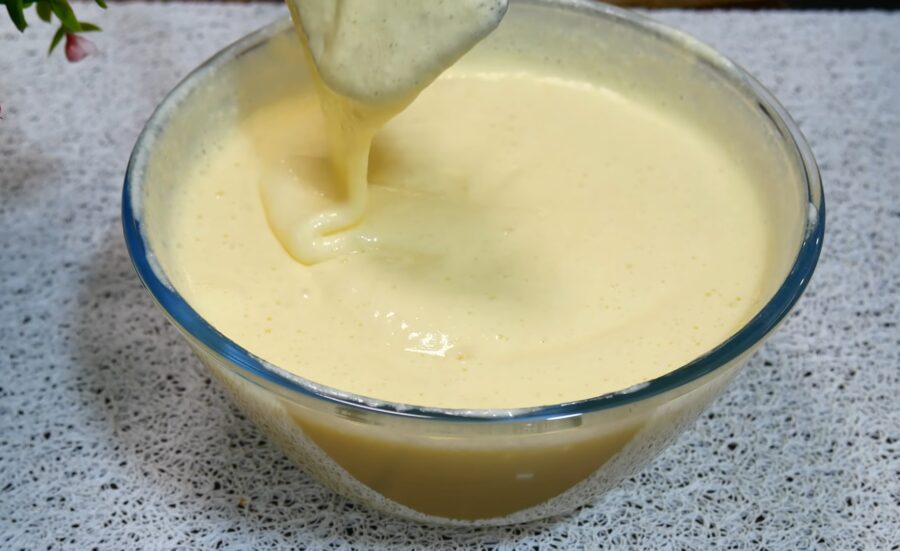Далі до жовтків з цукром додаємо розпушувач тіста, крохмаль і перемішуємо до однорідності. Беремо грецький йогурт (без цукру та фруктових добавок) і додаємо у миску з тістом. Перемішуємо до однорідності.