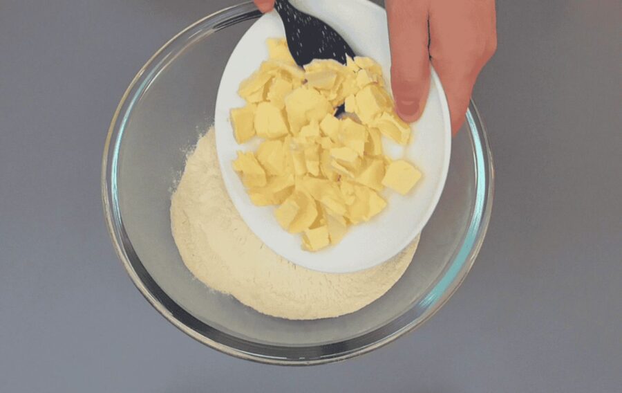 Масло розрізаємо на дрібні шматочки та ненадовго ставимо його у морозилку, щоб воно трішки підморозилось. Потім додаємо масло до борошна та робимо з цієї суміші крихту.