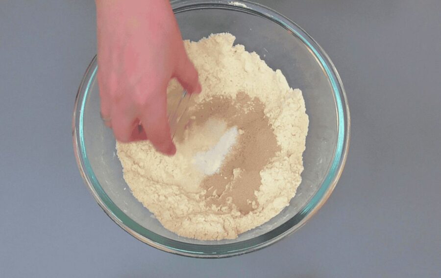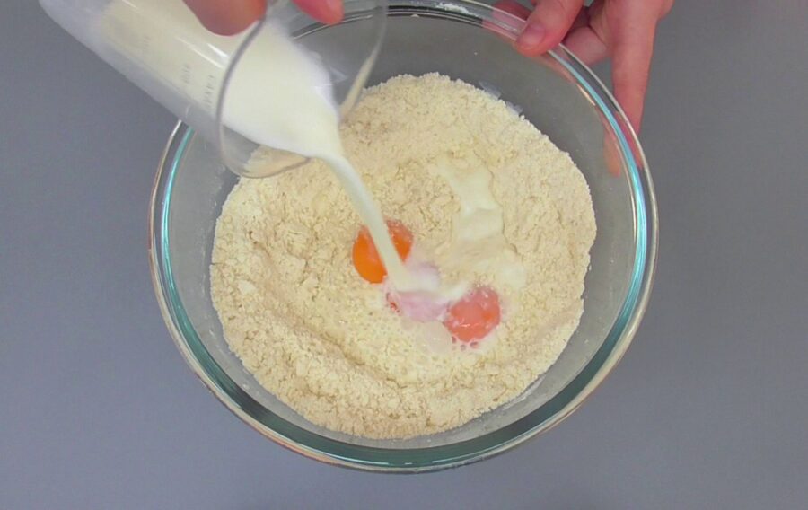 Потім в утворену крихту потрібно додати сухі дріжджі, цукор і сіль. Лише після цього добре перемішуємо отриману суміш. Якщо використовуєте свіжі дріжджі, потрібно попередньо розчинити їх у молоці. Потім додаємо жовтки, тепле молоко і замішуємо тісто.