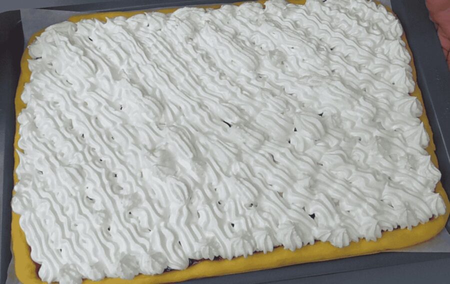 На викладене у форму тісто рівномірно накладіть начинку з повидла, варення або джему. Отримане безе накладаємо поверх начинки за допомогою кондитерського мішка. Якщо немає мішка, можна викласти безе ложкою, утворюючи невеликі, але красиві вершини.