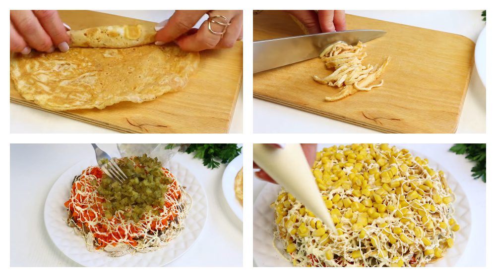 - Спочатку викладіть у блюдо шар м’яса, розібраного на волокна. Посоліть та поперчіть його. Далі потрібно викласти шар смажених грибів. Потім викладіть натерту на великій терці відварену моркву. Далі йде шар дрібно порізаних огірків, а потім викладіть відціджену від маринаду цибулю і, нарешті, яєчні смужки. Для прикрашання зверху усього викладіть кукурудзу та листочки петрушки.
