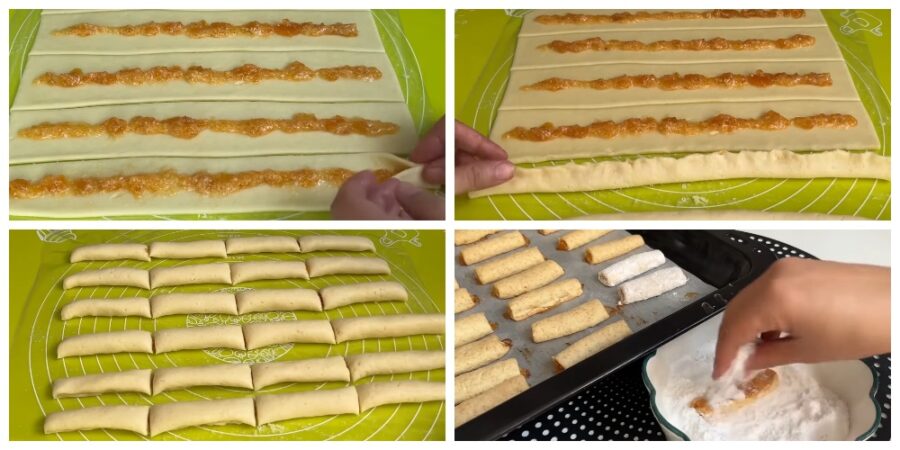 - На кожну стрічку викладайте джем, який спочатку змішайте з кокосовою стружкою. Стружку краще перетворити заздалегідь у борошно кавомолкою.