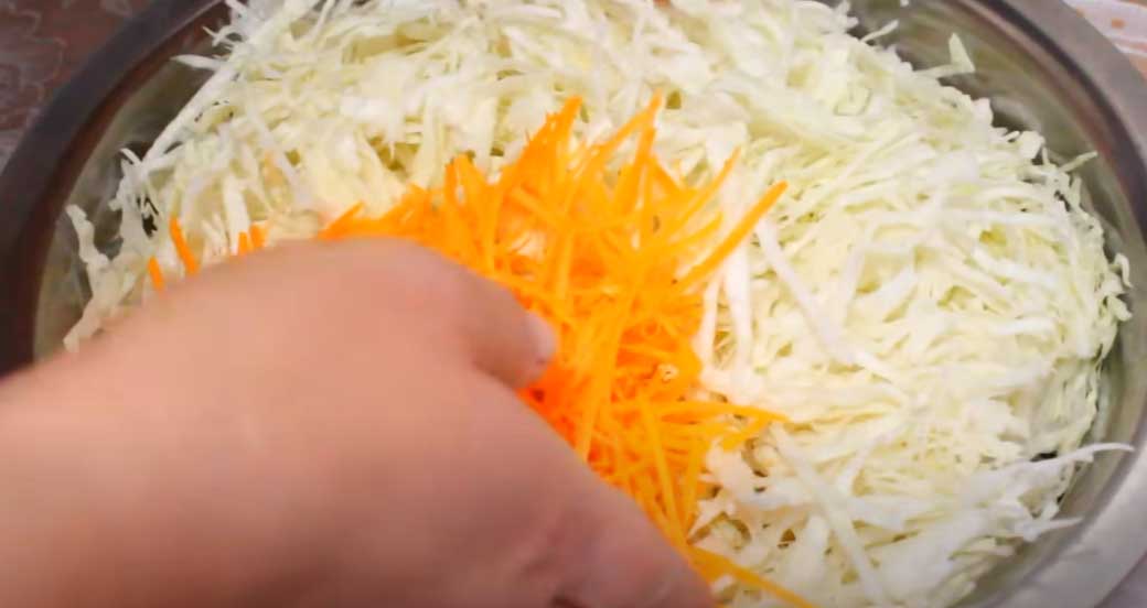 Капусту наріжте довгуватою соломкою. Обчищені морквини натріть на тертушці для корейської моркви. Якщо такої не маєте, тріть на звичайній – на смакових якостях салату це не відіб’ється, тільки на зовнішньому вигляді.